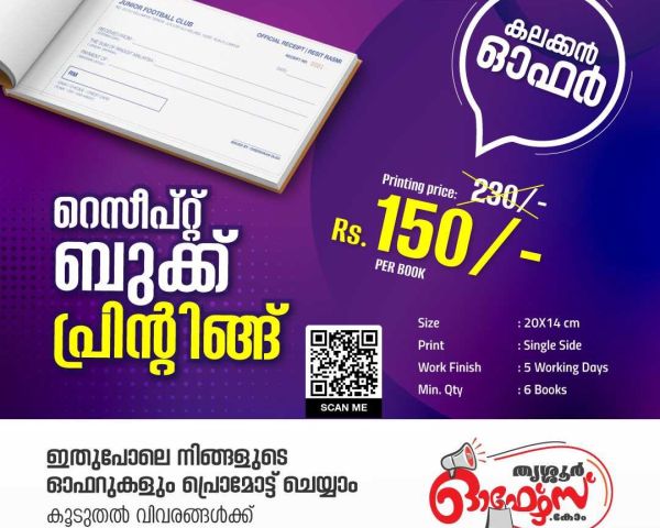 Get your receipt books printed at an incredible price of only 150 rupees in Thrissur. This deal is too good to resist, considering the original price of 230 rupees.